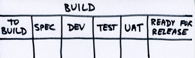 “Ready for release” is of course the downstream state of our Build kanban. Again, the exact software development process used to build the feature is not important here, but we can use the modern Kanban method to model it. The board visualizing it could look like this at one point: