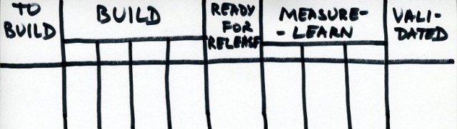 I was talking with Dave Rooney at lunchtime at the Agile Coach Camp in Montreal three months ago after his Lean Startup session and reflecting on this experience when I realized: the measure-learn part of build-measure-learn is a kanban. We have a value stream here, with several intermediate value-adding states. There are policies for pulling work from one state to the next and, obviously, tight WIP limits. The boundaries of this kanban are “ready for release” (upstream) and “validated” (downstream).